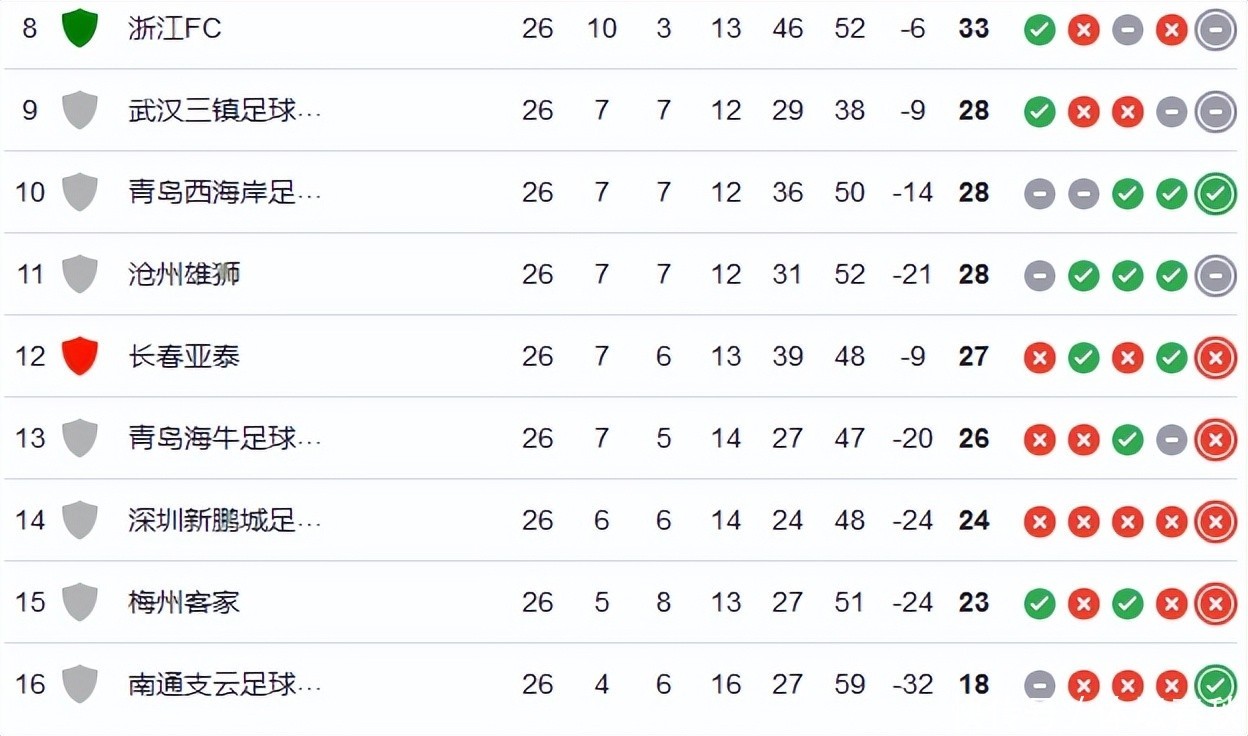 而各保级球队之间的竞争也仍是进入了尖锐化阶段,第26轮联赛扫尾后,多达7支球队仍靠近左迁的威迫。这种情况在中超历史上实属荒野,反应出本赛季联赛竞争的强烈进度。现在,武汉三镇、青岛西海岸、沧州雄狮、长春亚泰、青岛海牛、深圳新鹏城以及梅州客家齐在为保级而致力拼搏。现在,惟著名次倒数第一的南通支云,仍是基本锁定了一个左迁限额。