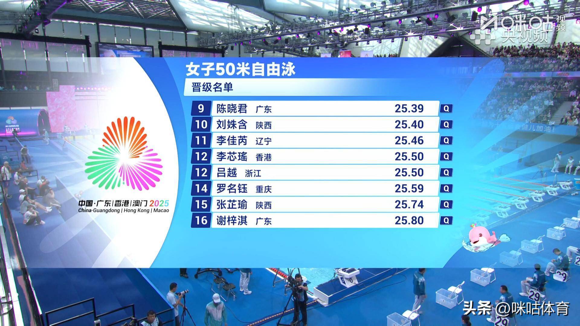全运会女子50米解放泳初赛,程玉洁24.75排行第一!