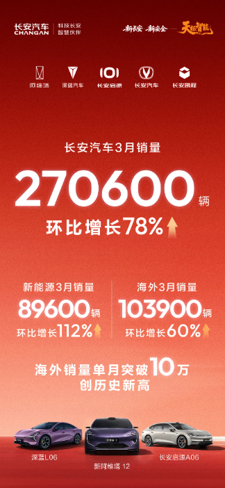 4月1日,重庆长安汽车股份有限公司(以下简称“长安汽车”)公布了最新的销量成绩。数据透露,长安汽车3月销量达270600辆,环比增长78%;国外售量创历史新高,达103900辆,环比增长60%;新动力销量89600辆,环比增长112%。从数据上看,在汽车破钞政策切换、旧年底市集需求提前开释的配景下,长安汽车仍保捏了得当增长势头。